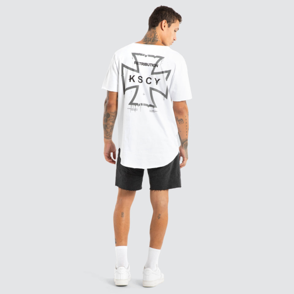 The Scrawl Raw V-Neck Tee in White is a distinctive piece from KSCY, crafted from 100% cotton and featuring a high-quality graphic print for an edgy streetwear vibe.