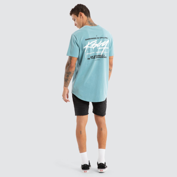 The Prodigy Dual Curved Tee in Blue from KSCY is a slim fit, long length tee with a unique curved hem. This piece is crafted from a blend of recycled cotton and cotton, delivering both style and sustainability.