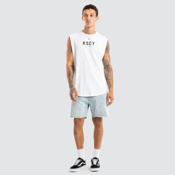 The Visualise Dual Curved Muscle White by KSCY is a slim fit, long length piece with a unique curved hem. Crafted from a blend of recycled cotton, this top features a high-quality graphic print.