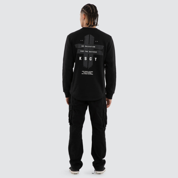 The Salvation Dual Curved Sweater in Jet Black from KSCY is a slim fit piece with a long length and curved hem finish featuring classic KSCY graphics.