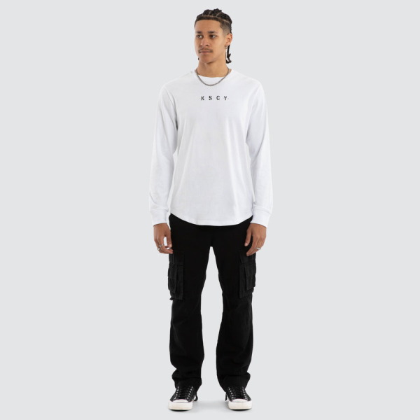 The Sledge Cape Back Long Sleeve Tee in Optical White is a classic piece from KSCY, featuring a slim fit and a long length with a curved hem.