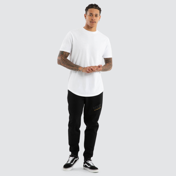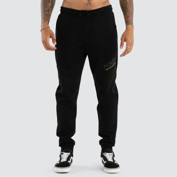 Make every step, a step in style with the Turret Slim Trackpant in Jet Black by Nena and Pasadena. These slim, cuffed trackpants are more than just comfortable - they're a statement. With a drawstring waist and signature "NXP" script graphics in black plastisol and gold foil that add a bold, signature touch to these must-have sweats. Crafted from a midweight interlock fl360 GSM a Classic Midweight Interlocked Fleece.