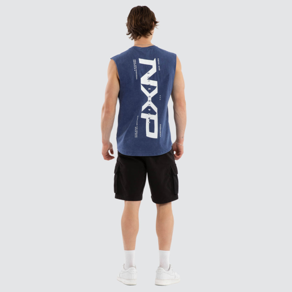 The Deliberate Dual Curved Muscle in Acid Wash Mazarine Blue from NXPA is a sleek, eco-friendly option for your streetwear collection. Crafted from recycled cotton, it offers a slim fit and a curved hem.