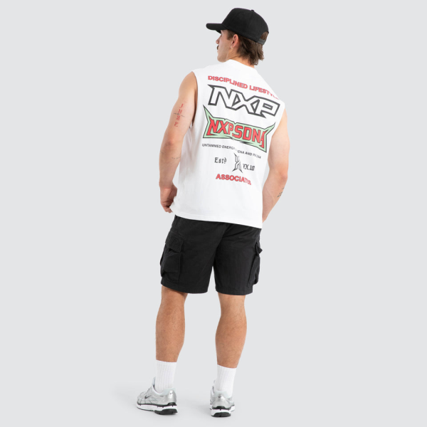 The Champion Raptor Muscle in White from NXP is a standout with its box fit, dropped shoulder, and baggy sleeve. Crafted from high-quality cotton, this piece is finished with thick neck ribbing for a distinctive style.