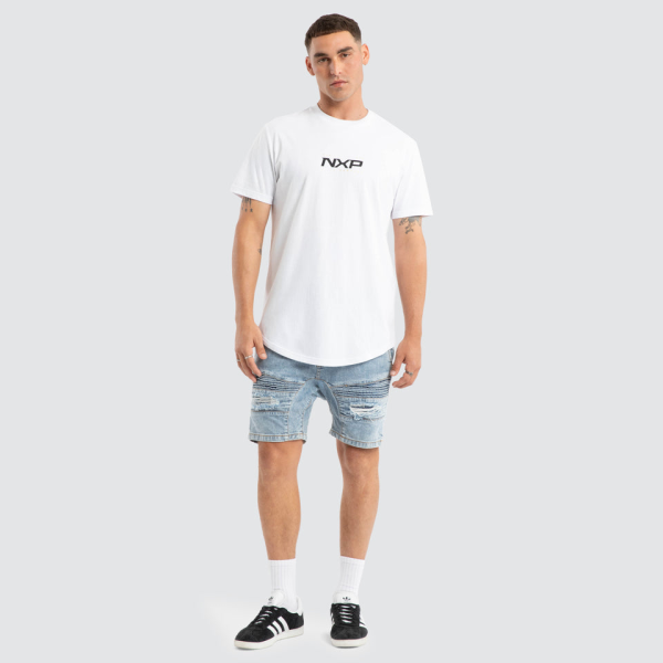The Deliberate Dual Curved Tee in White is a unique offering from NXP, with a slim fit and longer length finished with a curved hem. This shirt is made from a blend of recycled cotton and standard cotton, offering a soft touch and high-quality graphic print.